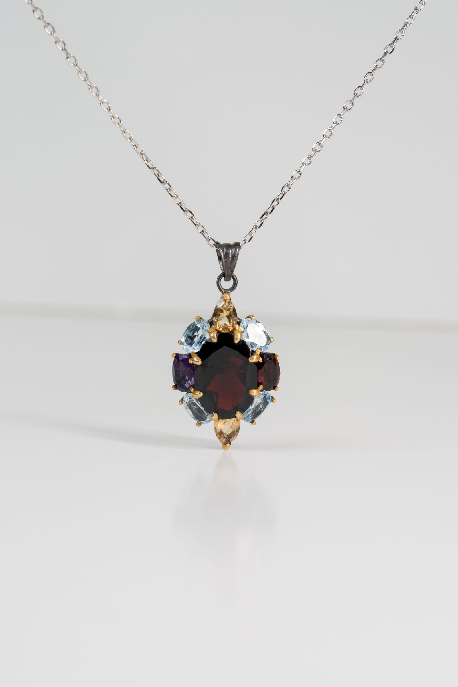 A radiant blend of Garnet, Topaz, Citrine, and Amethyst. Naturally unique gemstones symbolizing strength, clarity, joy, and serenity, brought together in a vibrant harmony of color and energy.